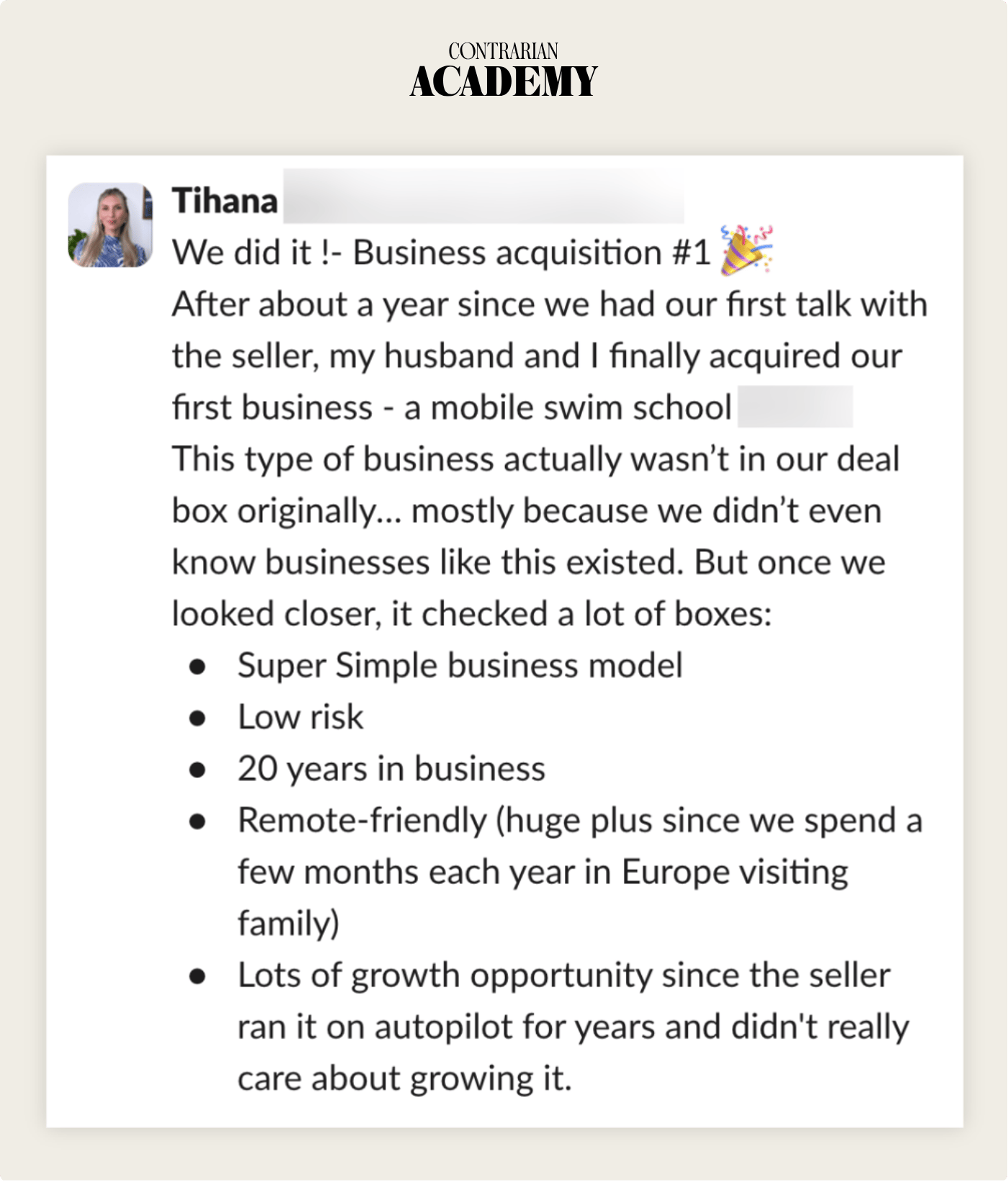 Tihana's husband led the negotiation. He anchored their offer so low that Tihana was convinced the seller would walk away entirely. "I was convinced the seller would just say 'no thanks,'" she wrote in the Contrarian Academy Slack channel after closing. His response: "Trust me, it will work."