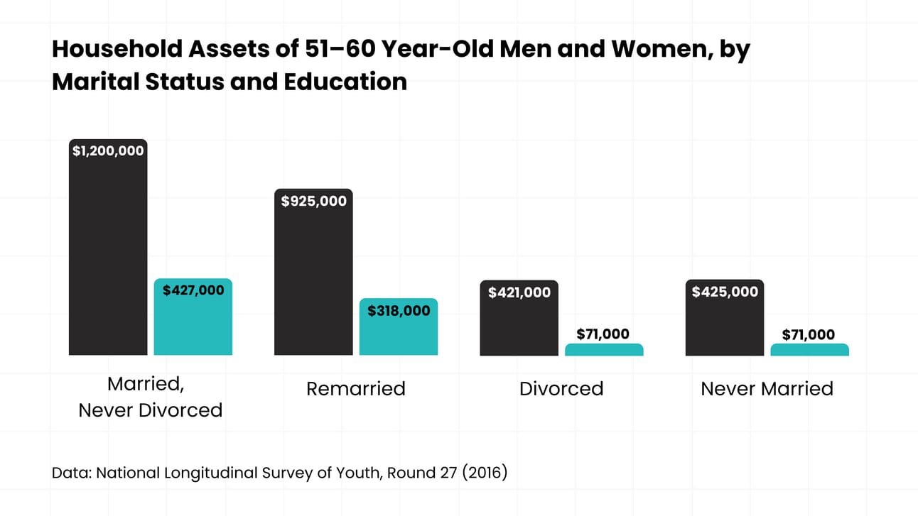 Economists say married couples are more likely to own appreciating assets. Over time, that helps lead to data like this: